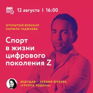 Вебинар с участием Камила Гаджиева «Спорт в жизни цифрового поколения Z» будет посвящен актуальной теме гармоничного развития ребенка в эпоху высоких технологий. Камил расскажет о моде на спорт, дизайне тела, философии единоборств как симбиозе духовного и физического развития, взаимосвязи занятий спортом и успехов в карьере, а также ответит на животрепещущий вопрос, стоящий перед многими родителями: стоит ли отдавать детей в спорт и с какого возраста.
