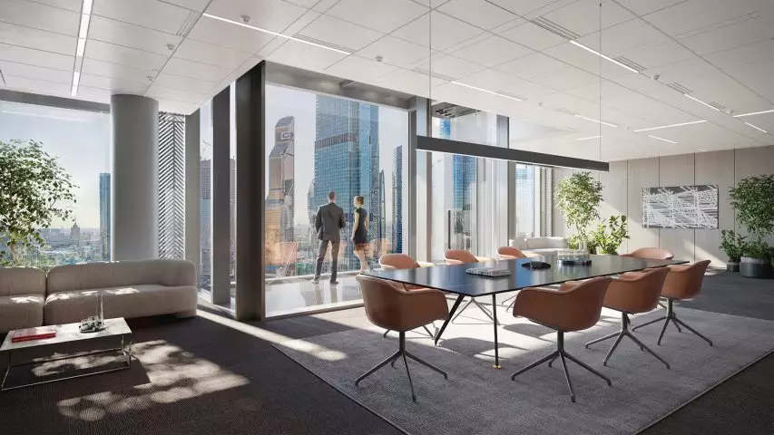 В стилобатной части разместится инфраструктура делового центра: фитнес-центр с бассейном, фуд-холл, кафе и рестораны, салоны красоты, сервисные службы, мини-маркет и магазины, банки и аптеки, а также лаундж-зоны. Особенностью деловых небоскребов станет наличие благоустроенного ландшафтного парка на открытой террасе шестого уровня стилобата, объединяющего башни. Общая площадь проекта составит 229 тыс. кв. м.