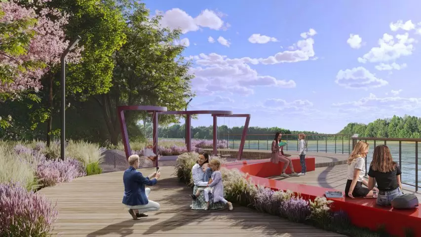 Благодаря перепаду высот, на территории появится множество видовых точек с живописными видами на акваторию реки. Основными точками притяжения набережной станут спортивные площадки для командных игр. Многофункциональные зоны спорта сформируют дружелюбное пространство для развития добрососедских отношений. Для прогулок и отдыха в парке установят скамьи и гамаки.