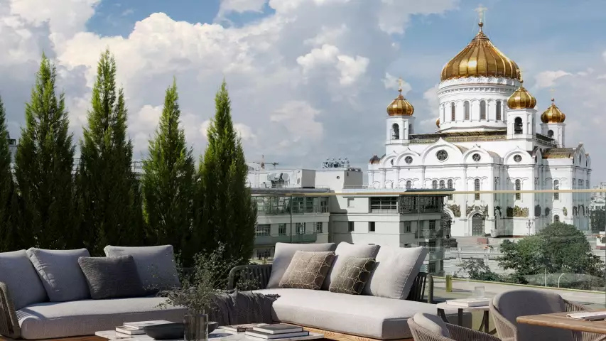 Сам пентхаус с высотой потолков 4,35 метра имеет четыре спальни и кабинет, а из его окон, выходящих на три стороны света, открываются виды на храм Христа Спасителя, церковь Илии Обыденного, Зачатьевский монастырь и тихие Обыденские переулки. В просторной кухне-гостиной площадью более 120 кв. м можно установить два дровяных камина, у которых приятно проводить тихие вечера. Этот пентхаус имеет два входа, один из которых — укромный, ведущий в приватную зону.