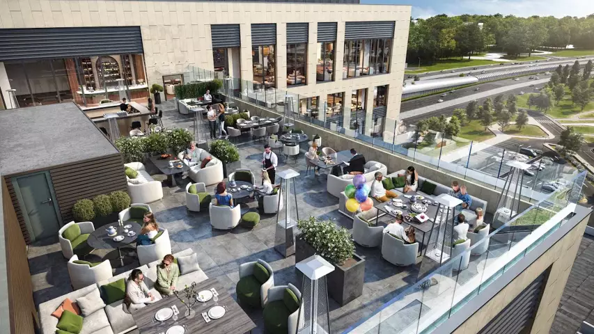 Говоря о транспортной логистике, необходимо упомянуть, что к услугам посетителей будет 365 машиномест в подземном и наземном паркингах - с зарядными станциями для электромобилей, автомойкой и шиномонтажом. И еще 1134 мест - на перехватывающей парковке, расположенной через дорогу от бизнес-квартала и соединяющейся с ним крытым переходом через станцию метро. Учитывая активный трафик на всех торговых этажах, строители позаботились о входах в здание с разных уровней – в том числе и об отдельном входе в ресторан, куда можно будет попасть, минуя лобби с пропускной системой. Предусмотрен и лифт приоритетного пользования, который быстро поднимется на 13-й этаж - там гостей ресторана сразу же встретит хостес.