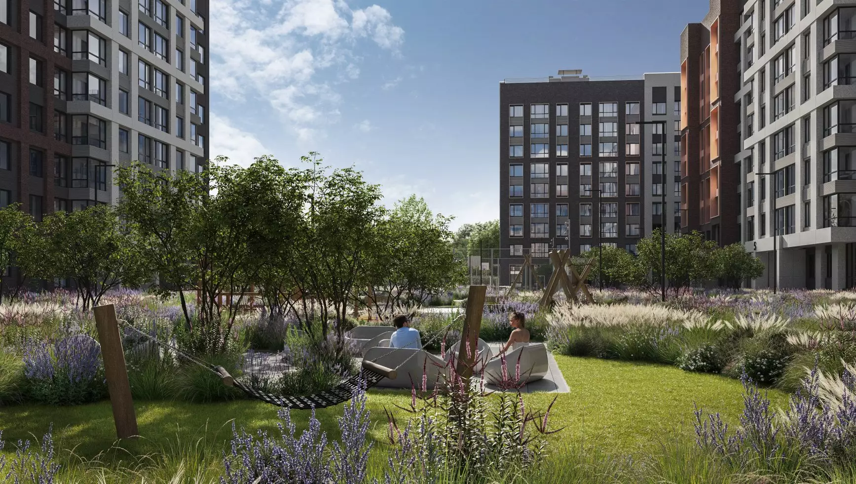 Люблю, когда жилой комплекс не просто как объект недвижимости, как жилье позиционируется, но и более глубокую концепцию имеет. Не просто - взяли и построили. Из-за близости к природе отличной идеей было подобрать такую цветовую гамму и стилистику, отличное сочетание с растительностью. Даёт усиление атмосфере, задаёт темп жизни. Я, как человек искусства, такое ценю.