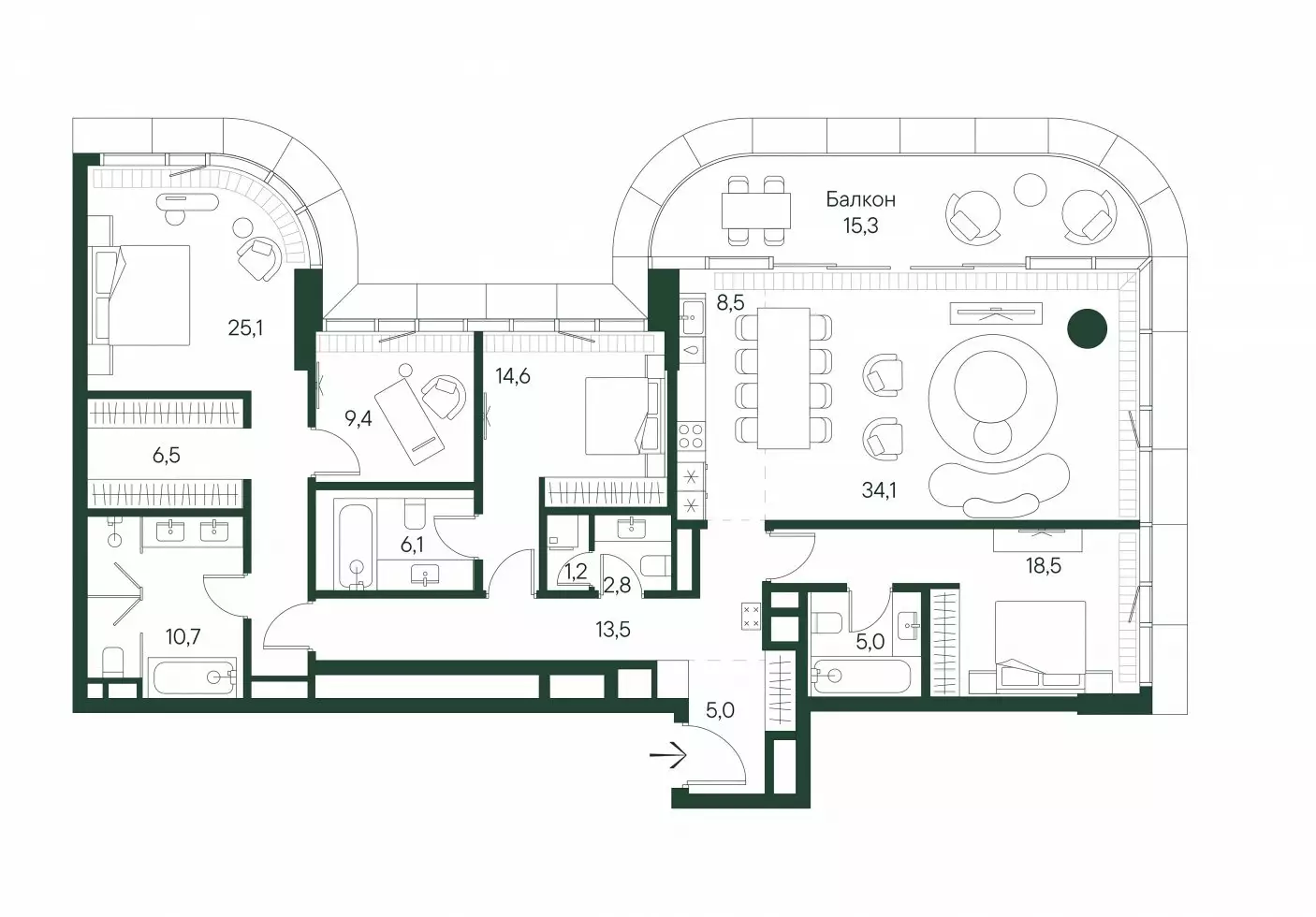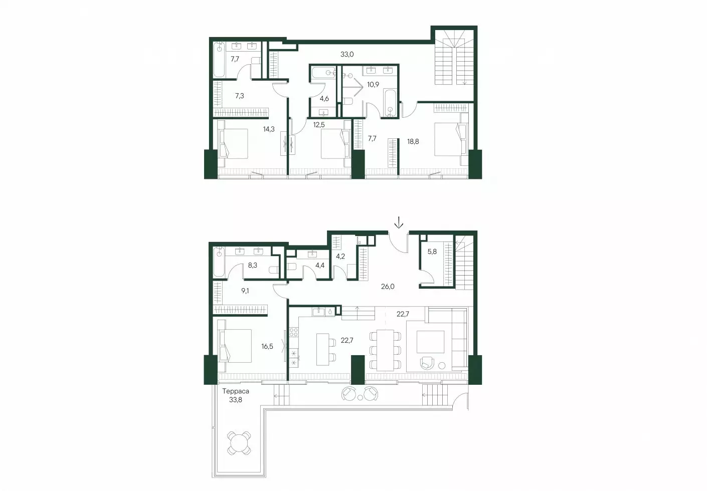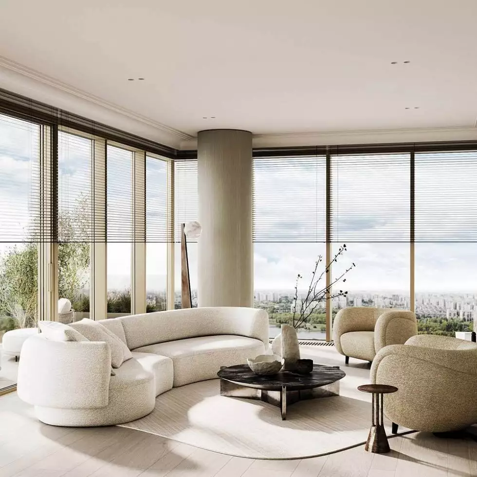 Покупателям предложены планировки с числом комнат от двух до пяти, площадью от 62 до 348 м². Квартиры имеют панорамные окна и высокие потолки — от 3,1 до 4,5 м (в зависимости от этажа), что обеспечивает отличные видовые характеристики. Важная особенность проекта — балконы с трансформируемым остеклением, которые можно будет использовать как террасы. В числе уникальных предложений есть двухуровневые таунхаусы и пентхаусы с террасами. Все квартиры будут передаваться застройщиком с финишной отделкой от дизайн-бюро Quadro Room.