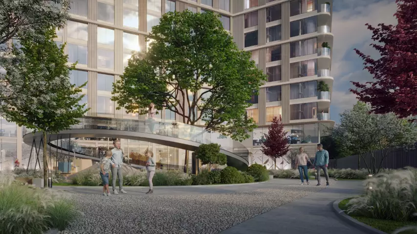Во дворе проекта создадут двухуровневую детскую площадку с парящим мостом, под которым будут закреплены качели и горки, вертикальный тоннель, канаты и шары для лазания, гамаки и бизи-борды. Все работы планируют завершить в 1 квартале 2026 года.
