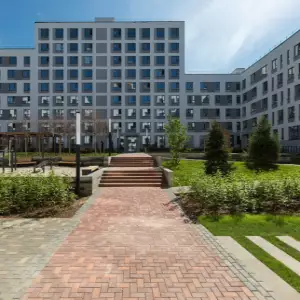 Двор нового дома закрыт от машин и устроен как зелёный сад. Здесь высажены разнообразные растения: уже взрослые деревья, кустарники, травы и цветы. Двор зонирован по функциям: детские площадки для разных возрастов, беседки-перголы для отдыха, спортивный корт. Игровые комплексы и места отдыха сделаны из натурального дерева: оно не нагревается летом и не накаляется зимой, безопасно для использования. Покрытие двора сделано из песка, газона и деревянных настилов. Двор всегда светлый благодаря переменной этажности квартала и двум сквозным аркам.