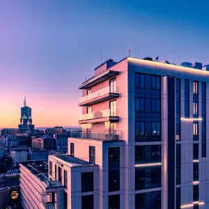 В доме 18 этажей, его первый уровень отдан под социальные пространства: магазины, детский образовательный центр, салон красоты и другие торговые и сервисные точки.