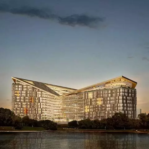 Штаб-квартира Яндекса представляет собой три разновысотных крыла, объединенных центральным атриумом с прозрачной кровлей. Легкий и технологичный фасад облицован металлическими панелями, значительная часть площади отведена под витражное остекление. Благоустроенная территория штаб-квартиры и её общественные зоны на первых этажах будут открытыми для всех посетителей.
