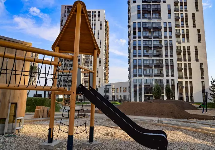 ГК А101 продолжает работы по благоустройству территории домов №2 и №3 жилого комплекса Прокшино, недалеко от одноименной станции метро Сокольнической линии. На данный момент готовность работ составляет свыше 60%.