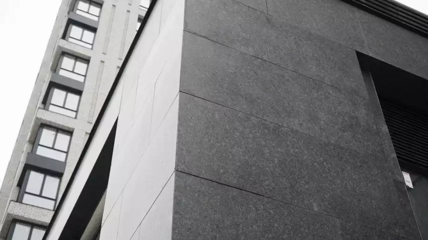 Для облицовки выбран африканский гранит Ангола Black. Это стильный черный камень с мягким, благородным рисунком, напоминающим ночной туман или дымчатое ночное небо. Гранит имеет ровный черный оттенок с вкраплениями перламутра. Этот камень строг и элегантен. Он выглядит нейтрально и в тоже время очень презентабельно.