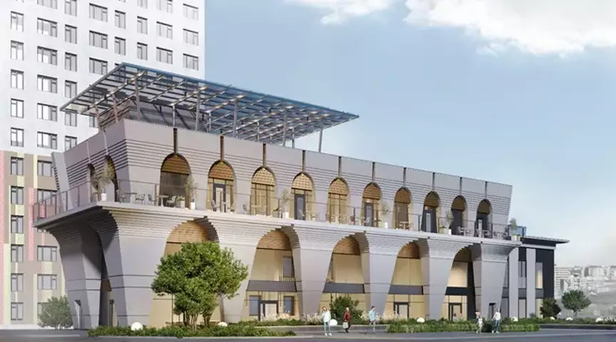 Комьюнити-центр, или Клуб друзей квартала, будет построен в стиле бионической архитектуры и гармонировать с фасадом и подиумом белоснежных небоскребов Wellton Towers. Объект будет состоять из двух объемов, выполненных в форме арок с отсылкой к арочной архитектуре Древнего Рима – к акведукам и галереям, выполненных в стиле современной бионики.