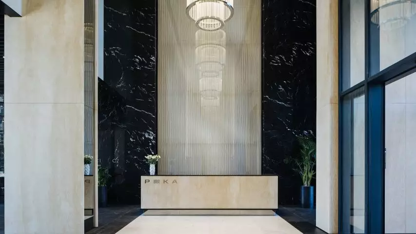 Эффектная зона ресепшен с девятиметровым водопадом украсила лобби клубного дома Река. 2 от Донстрой в Раменках. В парадном лобби площадью 400 кв. м и потолками высотой 10 м также разместятся приватные зоны с мягкой мебелью, детский клуб, колясочная и лапомойки для домашних питомцев.