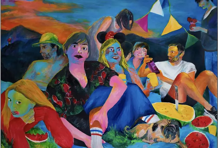 Полотна ученицы Владимира Дубосарского Оли Австрейх, сейчас живущей и работающей в Тель-Авиве, вызвали резонанс сразу после ее дебютной выставки Lights out в 2022 году. Парадоксальные сюжеты ее полотен притягивали и приводили в трепет: дамы-оборотни в высоких париках, танцы с волками, пир со свиньями.