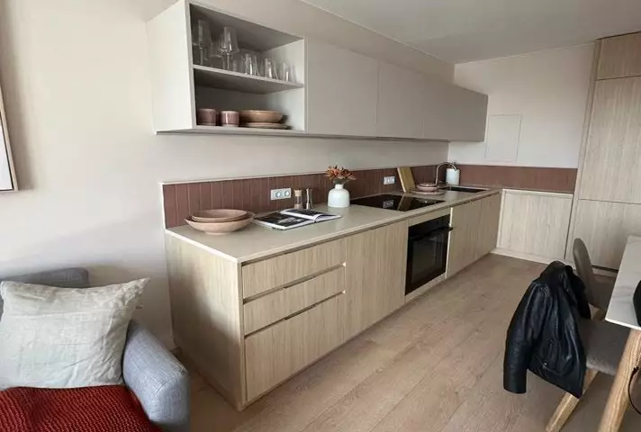 Выставленные на продажу лоты предусматривают дизайнерскую отделку и обустройство кухонного гарнитура со всей необходимой встроенной бытовой техникой. Специалисты установят электрический духовой шкаф, индукционную варочную поверхность из стеклокерамики, холодильник с системой Frost Free, вытяжку и посудомоечную машину.