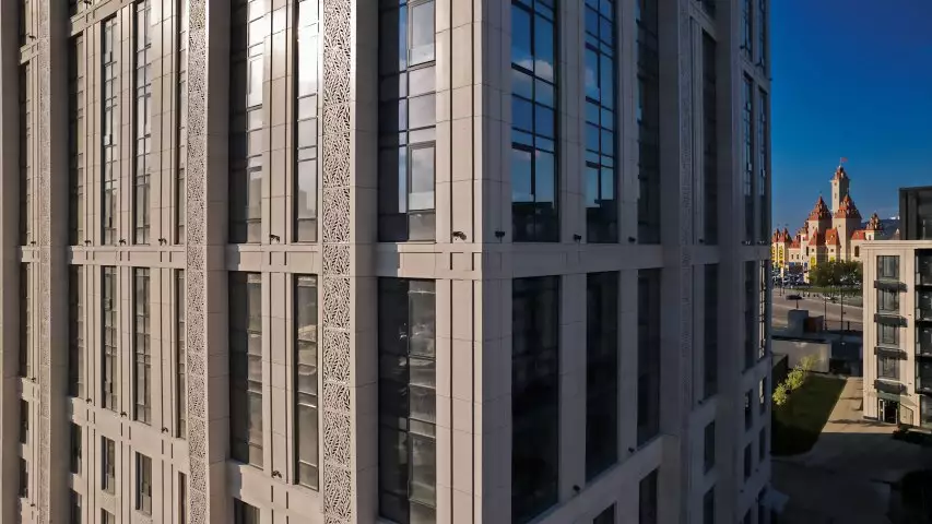 Эстетика Dream Towers — это современное прочтение роскошного стиля ар-деко. Фасады облицованы полированным португальским камнем. В вечернее время комплекс освещает эффектная подсветка, подчеркивающая архитектурные элементы, мягкий цвет натурального камня, изящную декоративную отделку, а также служит навигацией в темное время суток.