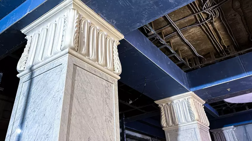 Уже сегодня строители Концерна КРОСТ приступили к работам по отделке белоснежным мрамором Бьянко Каррарa колонн и пилястр в парадных холлах Дома Щусева, а также к монтажу лепнины из гипса. Всего планируется использовать 50 кв. м. знаменитого белоснежного мрамора, который применялся столетиями с начала зарождения архитектуры и который по сей день является фаворитом среди натуральных камней. Для оформления пола во входных группах планируется использовать более 200 кв. м. роскошных гранитных плит Сезам Блэк, Белла Вайт и Сезам Лайт.