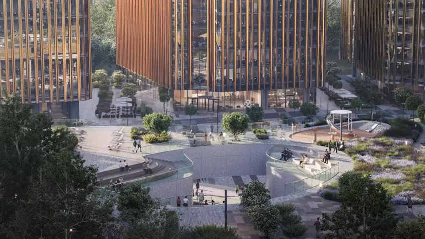Проектом предусмотрен образовательный центр с лекторием, мастерскими живописи и прикладного творчества. Также в стилобате разместится детский сад площадью более 700 кв. м. Еще одним пространством, предназначенным для жителей города, станет пешеходный мост, который пройдет над железнодорожными путями и соединит две части комплекса.