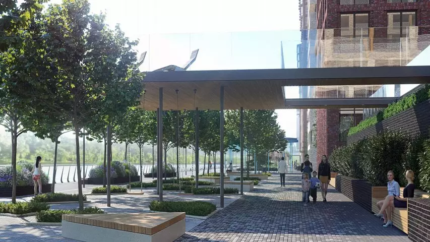 На противоположном берегу реки также планируется настоящий городской курорт. Причальная стенка и глубина реки до 4 метров позволяют создать в локации марину для яхт и катеров. Вдоль реки появится зеленый променад с местами отдыха и ритейлом, настоящей достопримечательностью станут аквакомплекс и плавучие бани на понтонах, смотровые площадки с арт-объектами и рестораны на воде.