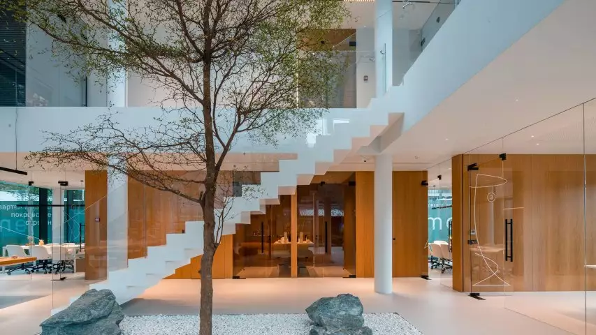 «Посадка дерева внутри уже построенного здания всегда непростой процесс. Особенно, когда речь идет о шестиметровом крупномере, недавно перенесшем длительную транспортировку и акклиматизацию. Поэтому к таким приемам оформления интерьера дизайнеры прибегают нечасто. Слишком высоки риски потерять растение. В нашем случае здание изначально проектировалось “вокруг дерева”, которое должно было стать его сердцем. И в визуальном и в смысловом плане. Пережить стресс от переезда дереву существенно помогает и тот факт, что его окружают стеклянные стены, обеспечивающий равномерный доступ солнечного света, а внутри заблаговременно создан подходящий микроклимат», – рассказал сооснователь бюро Babayants Architects Артем Бабаянц.