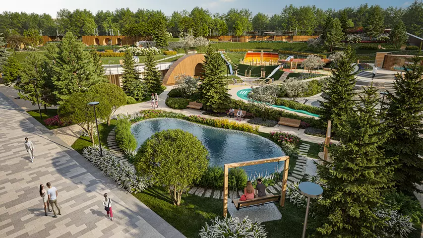 Компания размещает во дворе-парке спортивное оборудование. В зоне отдыха для подростков завершила каркас площадки для паркура. У сцены и многофункциональной площадки для командных игр сооружает амфитеатры и трибуны из натуральной лиственницы. Зону для игр с водой облицовывает архитектурным бетоном и гранитной брусчаткой. Также Sminex завершил строительство и провёл первый пробный запуск фонтана на общедоступном пешеходном бульваре с внешней стороны дома. Сооружение облицовано бразильским гранитом — плитами с мелкими полупрозрачными гранулами белого и сливочного цвета, разбавленными гранатовыми точками. Диаметр — 7,7 метра, высота струи достигает 5 метров.