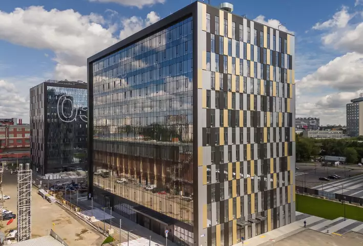 Общая площадь офисных площадей в составе корпуса — 15,5 тыс. кв. м, они занимают этажи с 3-го по 12-й. Панорамное остекление 12-этажного корпуса обеспечивает офисным помещениям высокий уровень инсоляции. На первом этаже расположены точки общепита, а также фитнес-центр с бассейном.