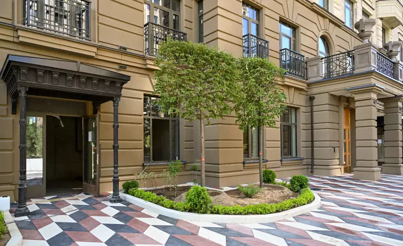 Пространство вокруг домов украшено мощением «ромб», которое выполнено художественной плиткой, разработанной совместно с архитектурным бюро AI architects и произведенной на российской фабрике Готика.