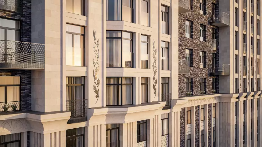В фасады дома девелопер Sminex инвестировал 3 млрд рублей. Из них 1,5 млрд рублей — стоимость отделочных материалов. Это натуральный камень — черногорский известняк, облицовочный кирпич, керамогранит и стеклофибробетон.