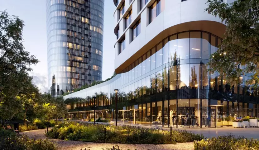 Архитектурное бюро Kleinewelt Аrchitekten спроектировало башни-маяки одновременно лаконичного и сложного силуэтов. Основание первой выполнено в форме круга, а второй – спирали, которые на уровне 10 этажа динамично переходят в строгие геометрические линии, обеспечивая уникальный контур. Специально разработанная архитектурная подсветка подчеркивает неординарные формы проекта в вечернее и ночное время. В отделке комплекса задействованы материалы: камень, металл, стекло. Авторы обозначают свой подход как «чувственный функционализм» – «строгий, сдержанный, при этом эмоциональный».