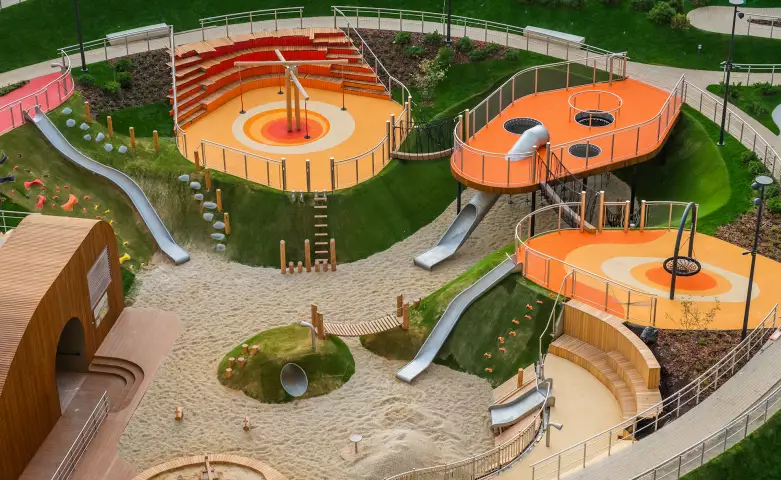 Важным элементом детской площадки стала обособленная зона игры с водой. Ручей здесь течёт по порогам, поворотным дамбам, попадает на мельницы, в брызгалки, фонтанчики и на винт Архимеда. Это открывает дополнительные возможности для активностей и познания окружающего мира. Ребёнок увлечённо экспериментирует с потоком, изучая законы физики. Игры с водой развивают его тактильно-кинестетическую чувствительность, мелкую моторику рук, расслабляют и заряжают энергией жизни.