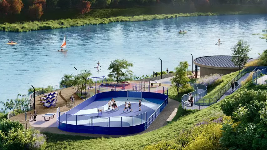 Зоны у воды станут комфортными местами для отдыха взрослых и детей: здесь можно будет расположиться в гамаках и шезлонгах или более активно провести время. Помимо площадок для воркаута, столов для настольного тенниса рядом с рекой предусмотрены два масштабных спортивных объекта. Так, для командных игр с мячом спроектирована спортивная зона площадью 825 кв. м, а под скалодром устроена опорная 6-метровая стена, которую, по задумке авторов, распишут граффити-художники, превратив ее в паблик-арт.