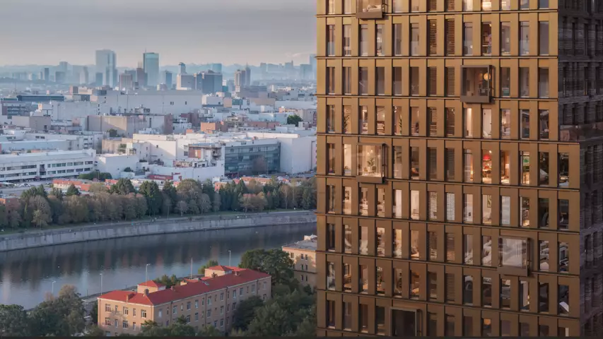 Выступающие объемы французских балконов, которые предусмотрены в 53% квартир, большое количество террас, фактурная облицовка и сложные контуры очертаний – все эти приемы помогают создать эффект рукотворности, контраст внешнего и внутреннего. Особое внимание архитекторы уделили окнам: 48 типологий окон с необычной технологией джамбо-остекления, которое буквально рушит четвертую стену в комнате, давая максимум света.