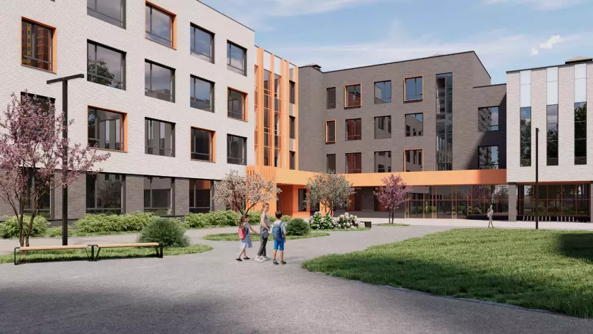 Общую территорию новой и действующей школ благоустроят. Проектом предусмотрено обновление тротуаров и озеленение более 50% территории, создание уличной площадки для торжественных общешкольных мероприятий с флагштоками. Для занятий физкультурой на свежем воздухе предусмотрены спортивно-развивающие зоны, в том числе для прыжков в длину и беговая дорожка, появится универсальная площадка для волейбола и баскетбола. Завершить строительство планируется в 2026 году.