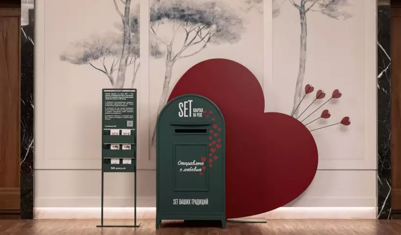 В главном фойе кинотеатра будет сложно пройти мимо огромного красного сердца. Настраивает на любовное настроение, помимо дизайна почтовой станции, и сторителлинг новой серии открыток. Их создательница, мультидисциплинарная художница и автор проекта sketching club, часто вдохновляется забавными наблюдениями из повседневной жизни. Карандашные эскизы с романтическими сюжетами Кристина делала во время прогулок вдоль реки Сетунь. Оказалось, что с живописной долиной, где строится SET, у нее уже связано множество приятных воспоминаний.
