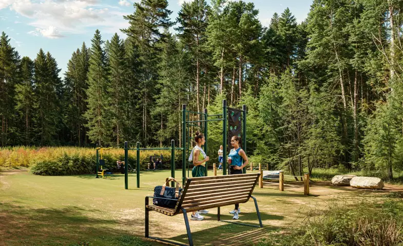 В лесной зоне проектом предусмотрено создание мест для спокойного отдыха, занятий спортом на свежем воздухе и творчества. В зоне спорта тренажеры и места для йоги. Внутри появятся тропы для пеших прогулок и занятий скандинавской ходьбой, беговые, лыжные и вело маршруты, а также детские игровые площадки. Лавочки, игровые и спортивные площадки будут выполнены из природных материалов и деликатно интегрированы в экопространство. На территории появится освещение и оформленная входная группа.