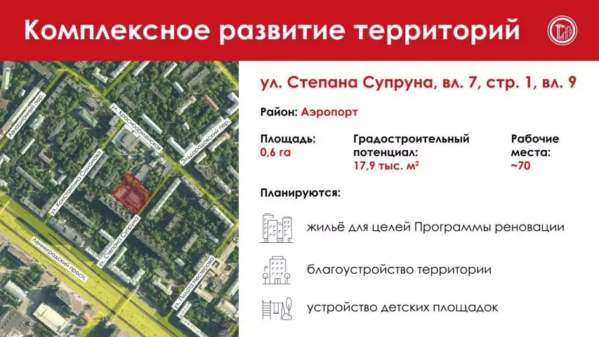 Оба земельных участка будут реорганизованы по программе комплексного развития территорий В частности, на улице Степана Супруна, вл. 7, стр. 1, вл. 9 (САО) планируют возвести около 18 тыс. кв.м различной недвижимости. Это и дома с новыми квартирами для переселения участников программы реновации, и коммерческая недвижимость, и детские игровые комплексы. На участке по адресу: ул. Херсонская, вл. 35 (ЮЗАО) также будет построено жильё по реновации, объекты коммерческой и социальной инфраструктуры.
