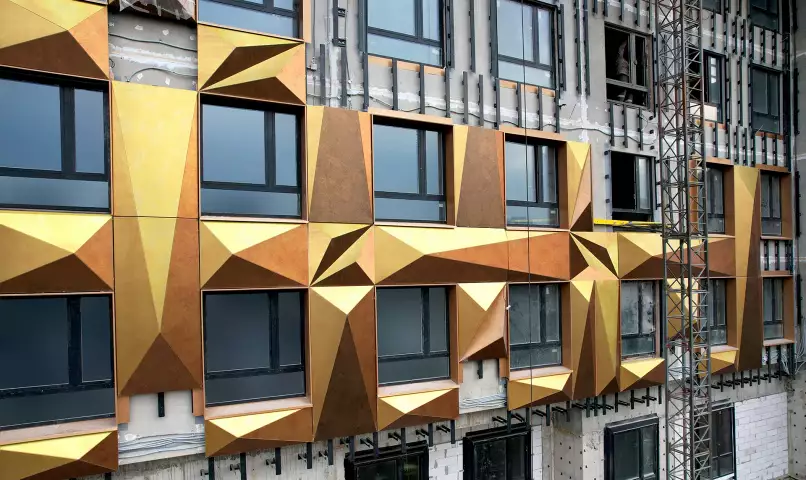 Специалисты Концерна завершили монтаж первых 50 сборных индивидуальных кассет на «золотом» фасаде дома. Каждая кассета имеет свою индивидуальную форму и цвет. Кассеты состоят из алюминиевых элементов с нанесенным на них рисунком. Художники разработали 4 базовых цвета, которые используются в производстве сборных элементов: шампань, золотой мед, червонное золото и чеканная монета.