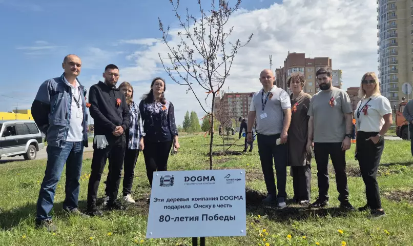 В Омске сотрудники компании DOGMA вместе с администрацией и жителями Ленинского округа на видовой аллее микрорайона Московка торжественно высадили розовые яблони. Каждое дерево украсили георгиевской лентой, которая является символом Победы и воинской славы, а рядом с яблонями установили табличку.