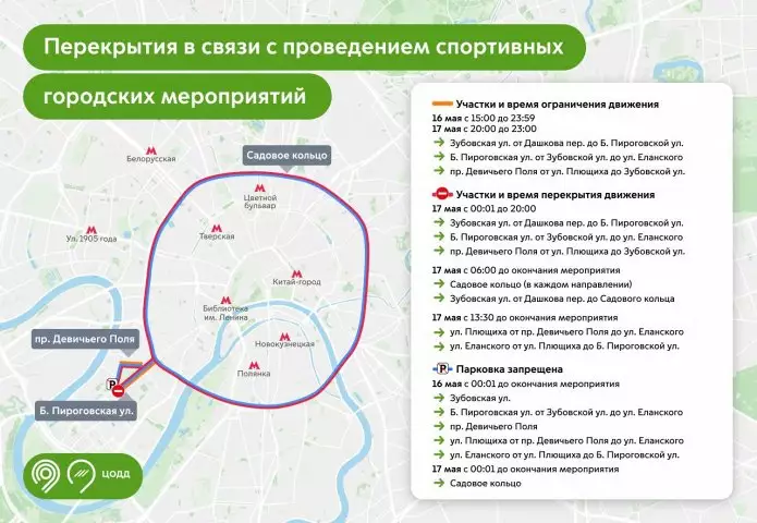 Также частично ограничат и возможности для парковки личных автомобилей. Так, 16 мая с 00:01 до окончания мероприятия нельзя будет припарковаться на улицах Зубовская, Большая Пироговская, Плющиха, Еланского, а также в проезде Девичьего Поля. А 17 мая с 00:01 до окончания мероприятия на Садовом кольце.
