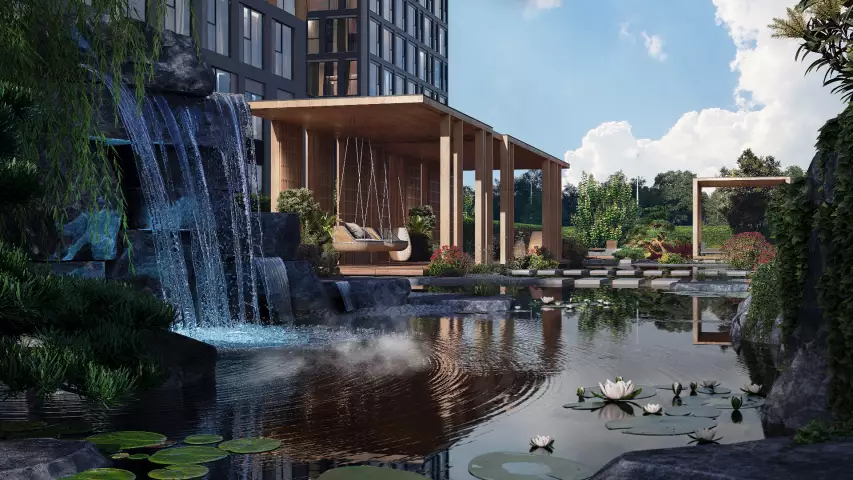 Концепция жилого комплекса основана на создании атмосферы азиатского ретрита: приватный внутренний двор и лобби выдержаны в стиле японского минимализма. Особое внимание уделено комфорту и расслаблению — освещение и аудио в лобби адаптируются под биоритмы резидентов, что способствует полноценному отдыху после напряженного дня. Неглубокий водоем с парящими гостиными, зона для йоги, спа-центр, азиатский «фудкорт» поддержат атмосферу премиального резорта и напомнят о безмятежной уединен¬ности островов Индонезии.