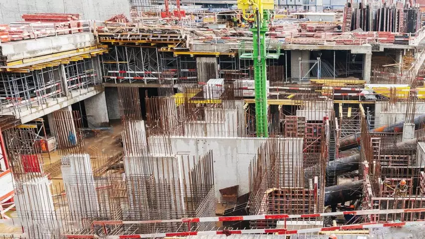 На данный момент продолжаются: земляные работы, устройство бетонной подготовки, распорной системы в комплексе, горизонтальной гидроизоляции, фундаментной плиты монолитных конструкций подземной части.