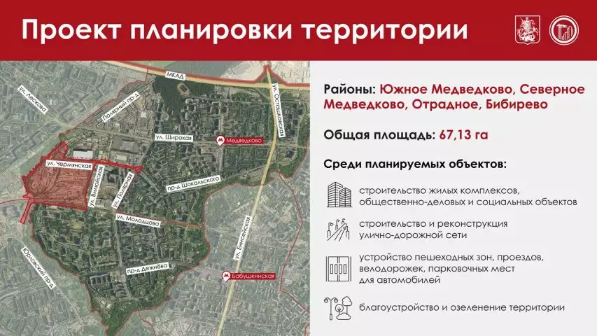 «На проектируемой территории, ограниченной улицами Вилюйской, Чермянской, Молодцова и Полярным проездом, появятся новые жилые комплексы, общественно-деловые и социальные объекты, включая школу, детские сады, поликлинику и подстанцию скорой помощи, культурно-досуговый центр», - написал в своем телеграм-канале мэр Москвы Сергей Собянин".