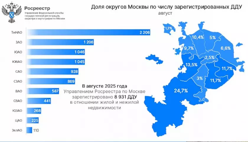 «Сделки с новостройками в Новой Москве, на западе и юге столицы составили половину от всех договоров на первичном рынке по итогам первых 8 месяцев 2025 года, — рассказывает руководитель Управления Росреестра по Москве Игорь Майданов. - Так, с января по август в Москве оформлено 74 096 ДДУ. Из них на ТиНАО пришлось 27,6% от общего количества ДДУ, на ЗАО – 13,5% и на ЮАО – 13%».