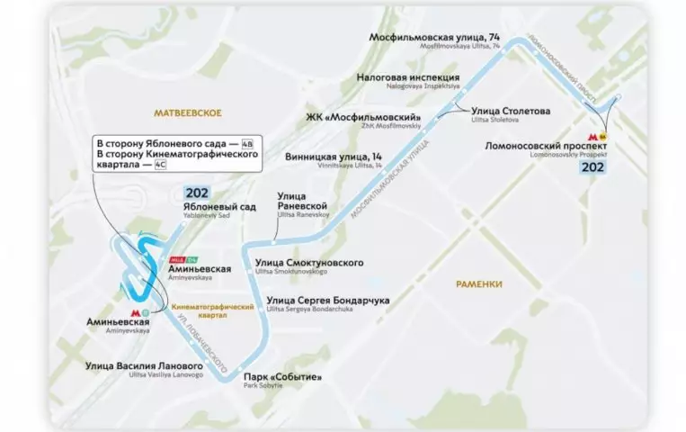 С субботы, 22 ноября, жители района Раменки (западный сектор столицы) получат новый наземный маршрут № 202. Он обеспечит транспортную связь жилых комплексов кинематографического квартала со станциями метро «Аминьевская» (БКЛ) и «Ломоносовский проспект» (Солнцевская линия).