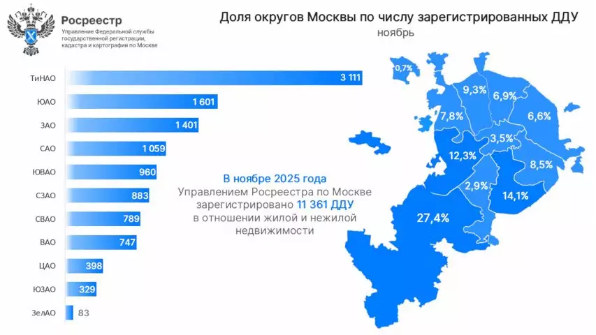 За январь–ноябрь 2025 года в Москве зарегистрировано 107 300 ДДУ. Распределение по ключевым округам: