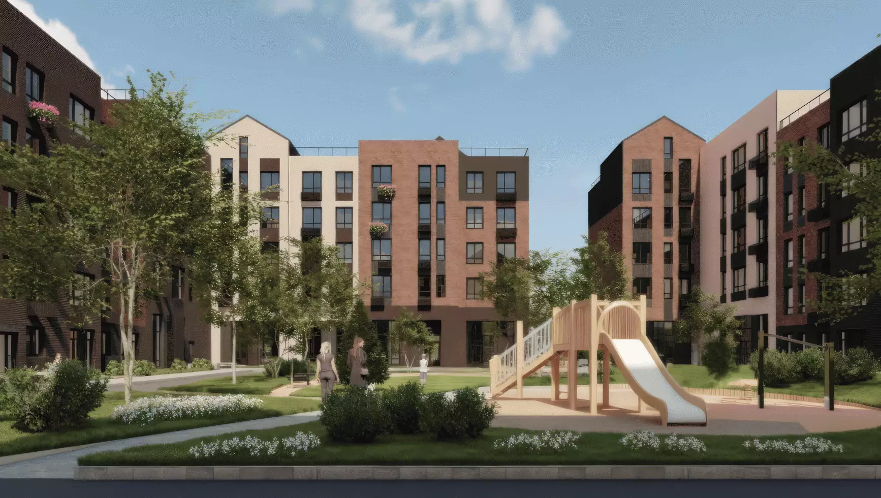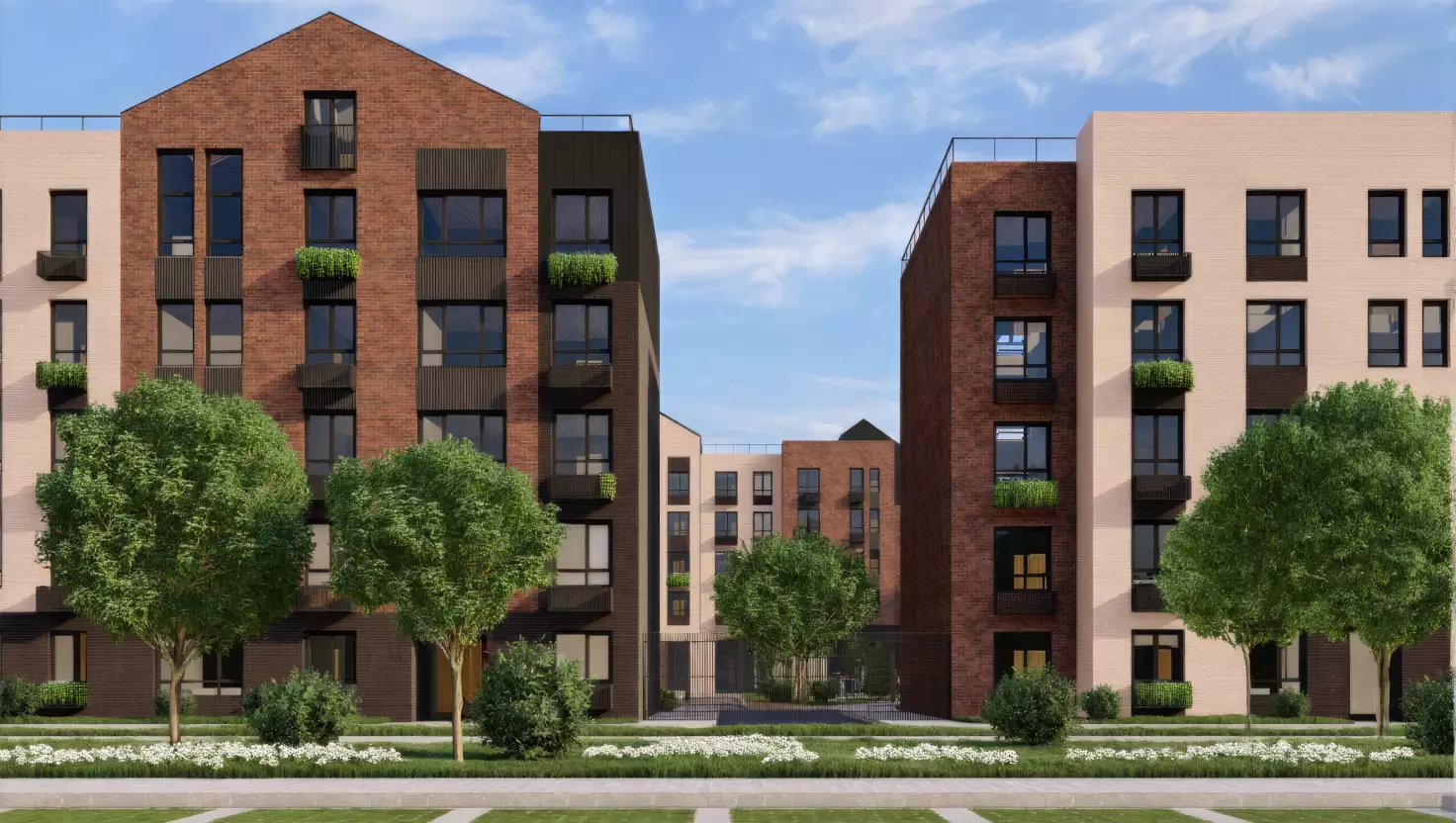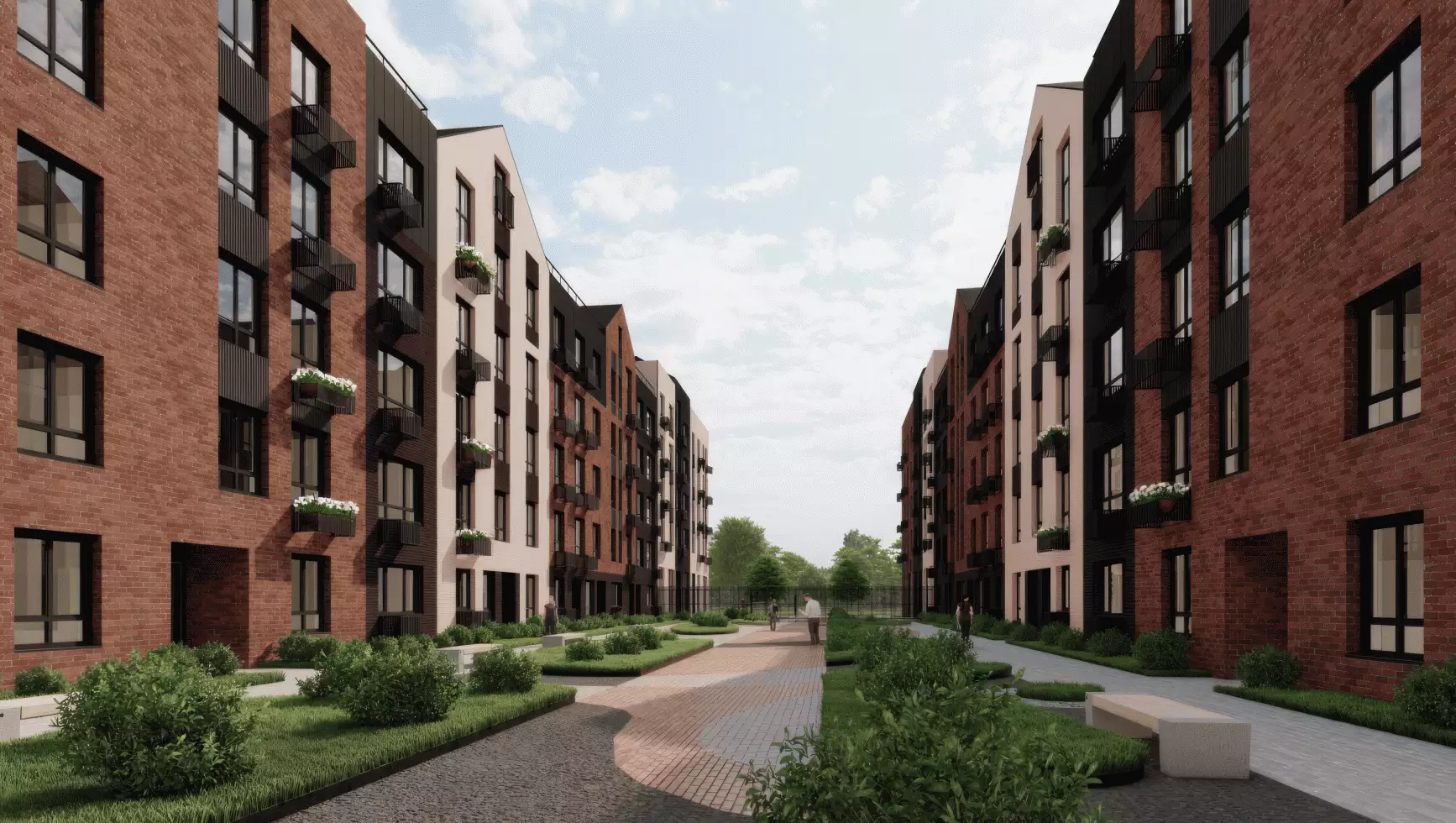 "Апрелевка Клаб" – это уютный квартал в европейском стиле. Его дома напоминают традиционную голландскую архитектуру. Невысокие здания с яркими фасадами и треугольными двускатными крышами создают сказочную атмосферу. Стены отделаны разноцветным кирпичом, это придает им легкость и динамику. Разные цветовые решения для секций делают застройку более живой. Объемные фасады сочетаются с панорамными окнами, из которых открываются виды на природу. Вертикальные линии делают дома изящными и устремленными вверх. Окна и двери размещены так, чтобы избежать монотонности. Их расположение разбивает плоскость стен и добавляет фасадам воздушности. Детали – декоративные элементы, кованые ограждения и аккуратные корзины кондиционеров – завершают образ современного европейского дома. Некоторые квартиры имеют отдельные входы прямо с улицы, это добавляет жилью приватности и комфорта.