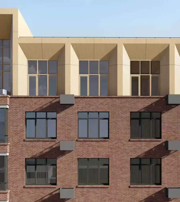 Проект жилого комплекса был разработан профессиональным архитектурным бюро. Основой концепции стал стиль современной европейской архитектуры с лаконичными линиями и выразительными фасадами. Здание отличается гармоничными пропорциями, динамичным силуэтом и интересными конструктивными решениями верхнего уровня. Фасад облицован темным кирпичом, создающим солидный и благородный вид. Его структуру оживляют ритмичные выступы, балконы и панорамные окна, благодаря которым квартиры наполнены естественным светом. На первом этаже использованы витражные конструкции. Входные группы оформлены с особым вниманием к деталям: просторные лобби выполнены в современном дизайне с качественной отделкой интерьера. Для удобства жителей предложены кладовые, колясочные, зоны ожидания для курьеров и гостей, а также консьерж-сервис.