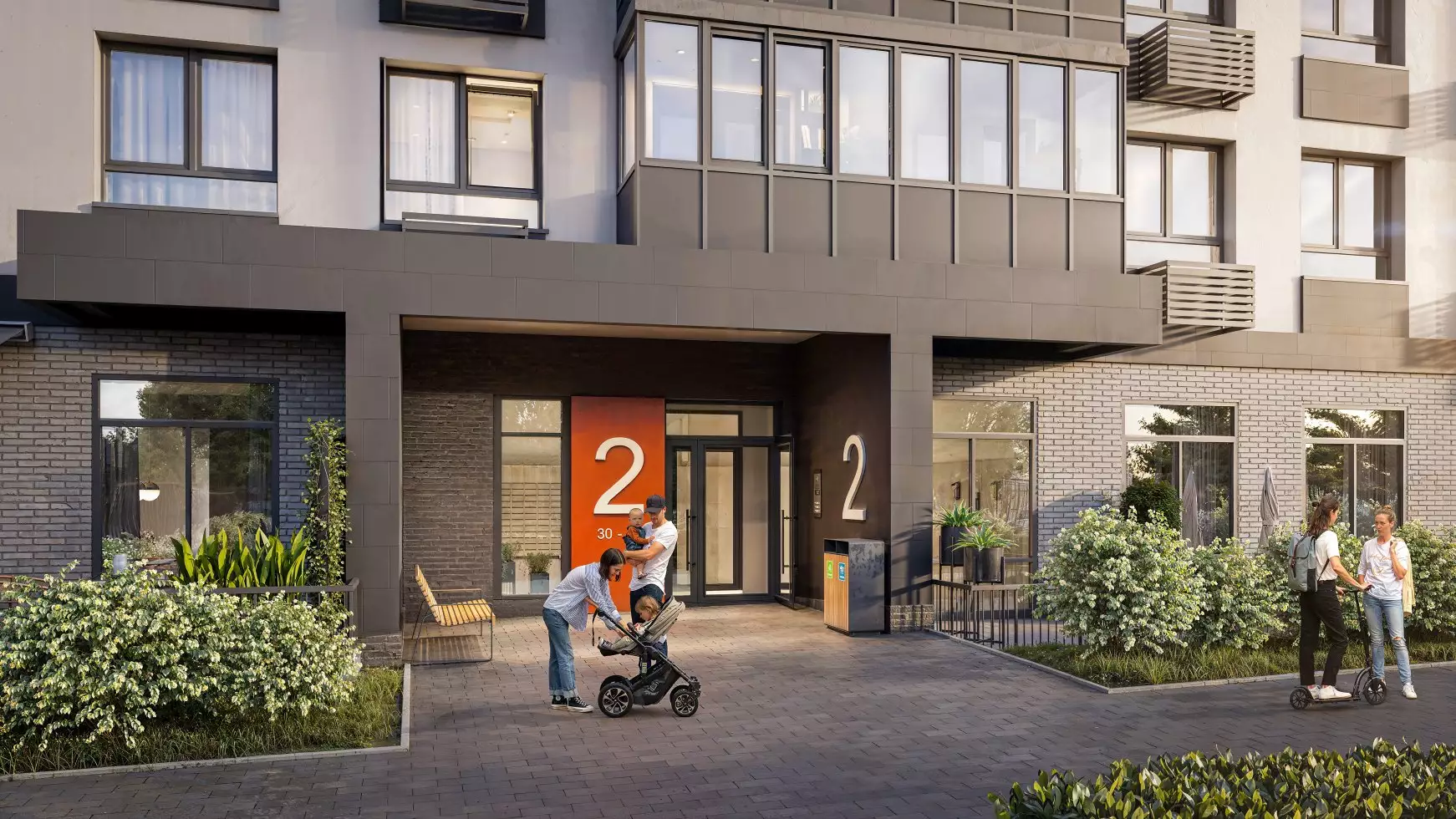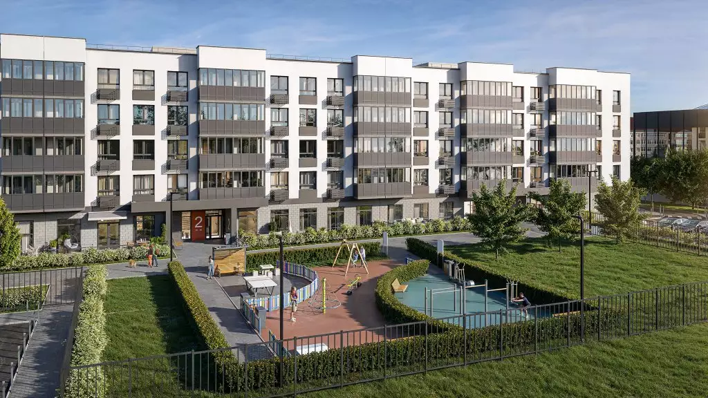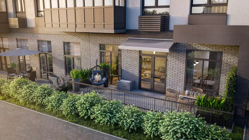 Новостройка представляет собой современный малоэтажный жилой дом на три подъезда с четкой геометрической композицией и контрастной цветовой палитрой. Его фасады сочетают белые и серые оштукатуренные поверхности, темно-серую и черную кирпичную облицовку на цокольном этаже и в вертикальных акцентах, а также светло-коричневые элементы, которые создают ритмичный узор по всей высоте здания. Архитектура характеризуется строгими линиями, выступающими объемами террас и плоскими крышами, характерными для стиля современного минимализма. Вертикальные ряды крупноформатных окон с темными рамами визуально увеличивают высоту здания; балконы с панорамным остеклением добавляют фасаду динамики и глубины. Конструкция здания выглядит монолитной, с акцентом на функциональность и эстетику чистых форм, без излишнего декора, за исключением играющих с объемом и цветом архитектурных деталей и гармонично вписанных в экстерьер кондиционерных корзин. Входные группы здания спроектированы на уровне земли, чтобы обеспечить удобный вход родителям с колясками и маломобильным жильцам. Внутри МОПов планируется выполнение лаконичной отделки в нейтральных тонах.