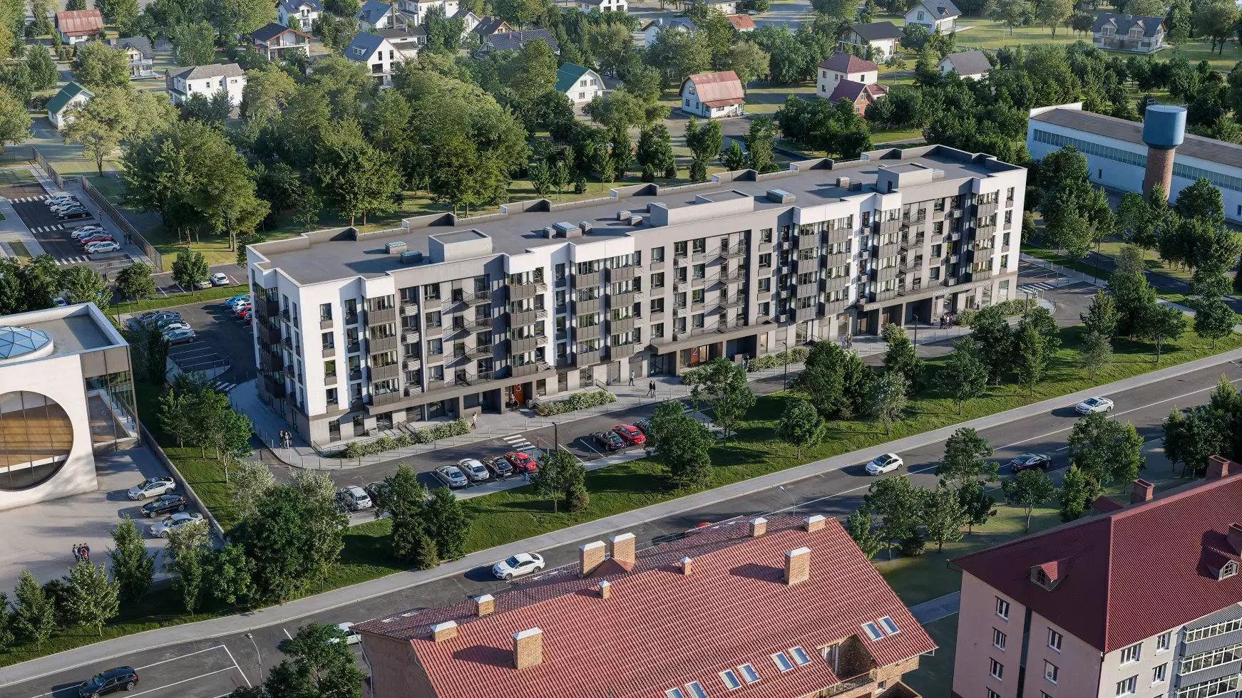 Прилегающая территория новостройки будет украшена газонами, деревьями и цветочными клумбами, а декоративная живая ограда из кустарников станет важным акцентом ландшафтного оформления. Внутренний двор продуман для отдыха и активностей жителей разного возраста и включает: детские игровые площадки с песочницами, качелями, канатными комплексами; столы для игры в пинг-понг и спортивные снаряды — брусья и турники — для подростков и активных взрослых, а также комфортные лавочки для родителей и пешеходный променад для прогулок. Дворовая территория будет закрыта и защищена от проезжей части. Для владельцев автомобилей предусмотрена наземная стоянка на 81 машино-место. Возле подъездов установят удобные скамьи, а также выделят места для парковки велосипедов. Первый этаж здания отдадут под коммерческие помещения, которые обеспечат дополнительные сервисы для жителей. В пешей доступности от дома работают: