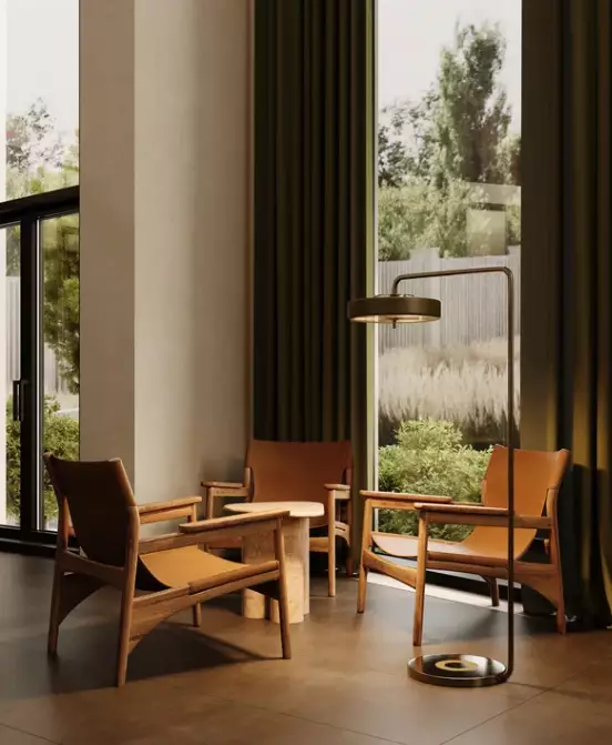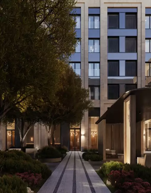 В составе проекта запланирован благоустроенный двор в европейском стиле. Площадь озеленения составляет 2291,6 м². Во дворе появится амфитеатр, коворкинг под навесом, зоны для спокойного отдыха, детские и спортивные площадки. Раскидистые ивы и декоративные кустарники создадут атмосферу европейского поместья. Концепция пространства вдохновлена образом древнегреческой Аркадии, поэтому среда двора построена на античном идеале баланса природы и человека. Центральным элементом станет длинная прогулочная аллея, выполняющая роль композиционной оси. Она объединит все зоны ландшафтного двора в единую зелёную экосистему. Для комфорта жителей активные зоны вынесены на внешний периметр, а детские площадки и спортивные пространства останутся на закрытой территории. При этом они не затрагивают приватность центральных зон. Внутренняя часть двора предназначена для уединения. Вся необходимая повседневная инфраструктура есть рядом с домом. В числе прочего в шаговой доступности от новостройки находятся: