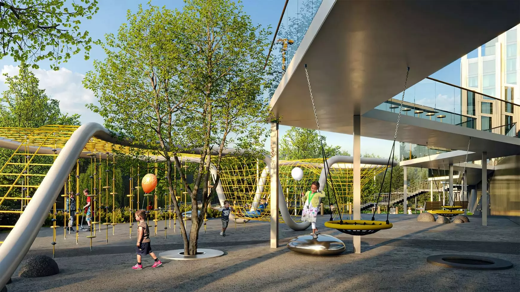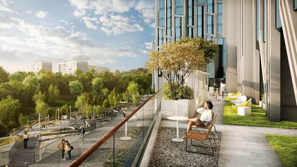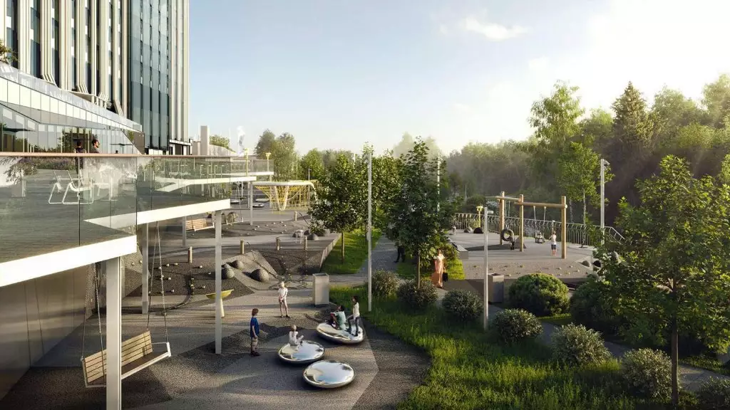 Территория новостройки превратится в комфортное пространство для жизни и отдыха. Архитекторы предусмотрели всесезонное озеленение, которое сохранит уютную атмосферу в любое время года. Во дворах появятся уединённые зоны с удобными местами для чтения и релакса. Детские площадки из экологичных материалов займут специально отведённые для них участки. Для любителей спорта оборудуют современные воркаут-зоны. На стилобате построят видовой мост и террасы с биокаминами, где можно будет отдыхать на дизайнерской мебели. Жители получат доступ к приватному природному лесопарку. Эта природная зона рядом с комплексом сделает прогулки ещё комфортнее. В состав встроенной инфраструктуры квартала войдут: