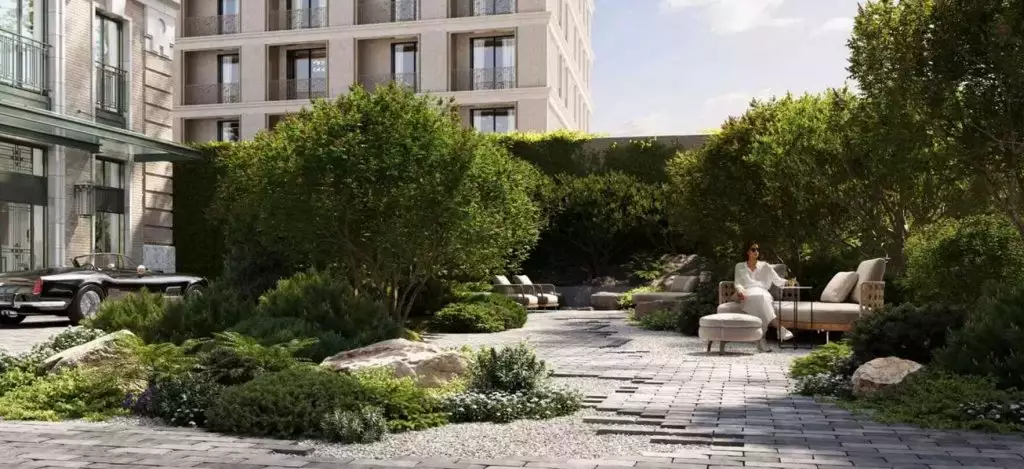 Территорию вокруг комплекса благоустроят и озеленят. Наземных парковочных мест не будет. Для отдыха резидентов предусмотрен приватный природный сад в духе французских парков, выполненный по проекту бюро Derevo Park. Он тоже носит отпечаток французской элегантности – большие тенистые деревья, журчащие водоемы, камни-валуны и извилистые гравийные дорожки располагают к релаксу и умиротворению. В центре сада разместится пруд, а по его краям – беседки, скамьи и шезлонги. В состав встроенной инфраструктуры комплекса войдет собственный веллнес-центр, где резидентам будут доступны: